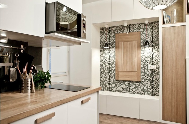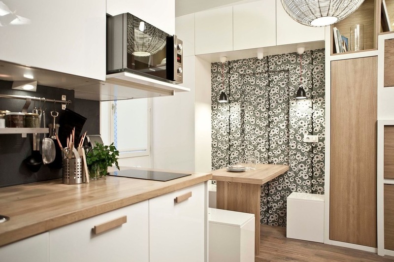 当这个毫不起眼的木板被折叠起来,这个小厨房得到更多的空间。打开来,就成了一个四人餐桌。上方圆滑的白色面板下隐藏更多存储空间。