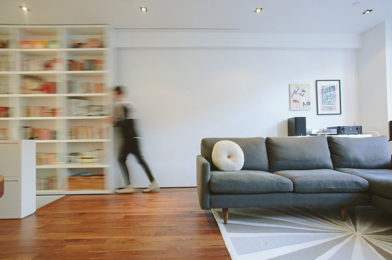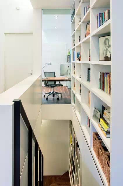 充分利用了楼梯旁边、地板到天花板的存储空间,安装了一个适合书架的轨道系统。可以固定在楼梯旁边,或是滑动到房间作为隔断或方便取读。