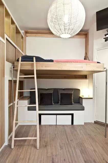 如果向下翻折在空余的空间,并不算合理存在的设计。这个折叠床的设计完全适合架空在沙发上,所以在睡前并不需要将家具繁琐地移位,只需要翻下沙发的背垫和床。瞧,出色的小空间改造!
