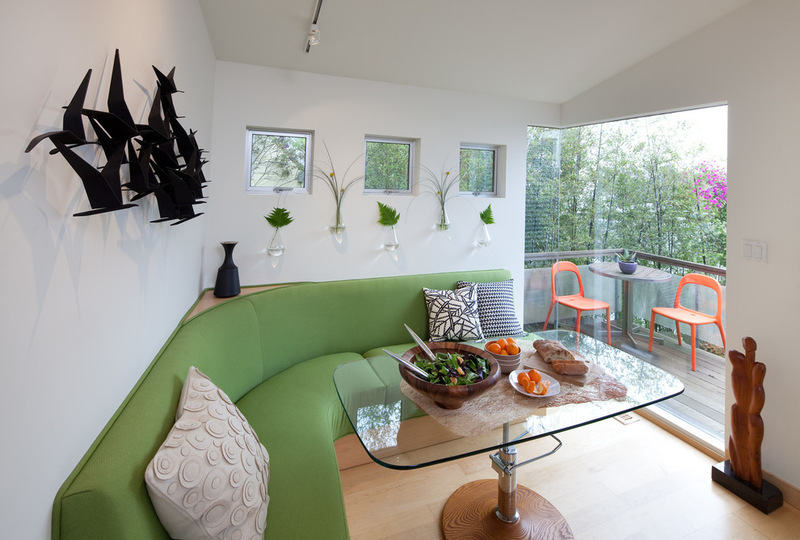 有这个独特的设计,在小空间拥有大尺寸床也不是天方夜谭,床可以大部分滑动到架高的地板下面,装点几个抱枕就可以变成一个沙发。利用一个富有设计感的存储柜可以使简单的隔断成为生活空间一个实用的部分。