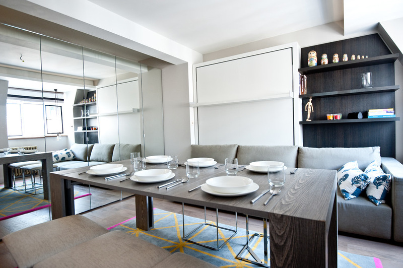 继续是折叠床的同一空间。在收起床铺和茶几的情况下,把窄边桌转换成容纳至少6人用餐的餐桌并不困难。不要小看那个从衣柜里滚出来的立方体软坐垫,怎么蹦出来的六张方凳子?这就是关键了!