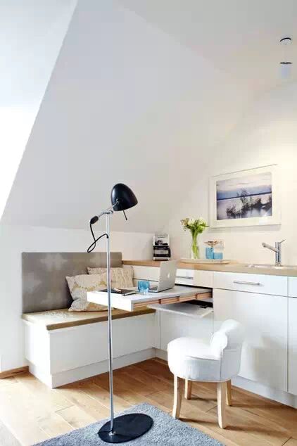 如果用定制的木工来规划小空间,隐藏的工作区是一个聪明的方式,简易的工作表面上和存储柜统一到靠墙的窄小空间,收起搁板完全就和墙融为一体。