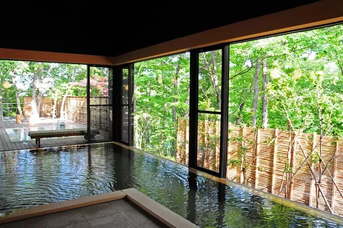 设计师精心设计了三个露天浴池,它们被巧妙的设计在树木的间隔里,与整个环境融为一体。如此一来,以传统为特色的老式温泉旅馆,脱胎换骨成了全新的现代度假宾馆。