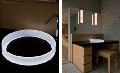 卫浴间采用诺锐斯特光影浴缸,独特的光影材质,即使在黑夜里,也无法掩饰它的光芒。浴缸的柔美曲线与拉窗冷峻的垂直线条, 对比出一种强烈的日式美,以及一种可以将人温柔的包围其中的舒适感。